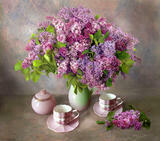 Алмазная вышивка «Нежный букет сирени и две чайные чашки» 30x40 см